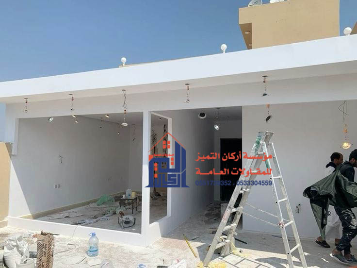3. الدهانات والديكور: يتم تطبيق الدهانات، أو ورق الحائط، أو الديكورات الخشبية النهائية حسب اختيار العميل، مما يحول الملحق إلى مجلس فخم وعصري.